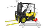 Forklifti engebeli alanlarda kullanmayın. Kulanmak kaçınılmaz ise yavaş ve dikkatli olun. Demiryolu üzerinde yavaş ve mümkün olduğunca çapraz geçin. Demiryolu geçerken forklift ciddi bir şekilde sarsılır. Yavaş bir geçiş için çapraz bir şekilde ve her seferinde bir lastiği geçirerek ilerleyin |